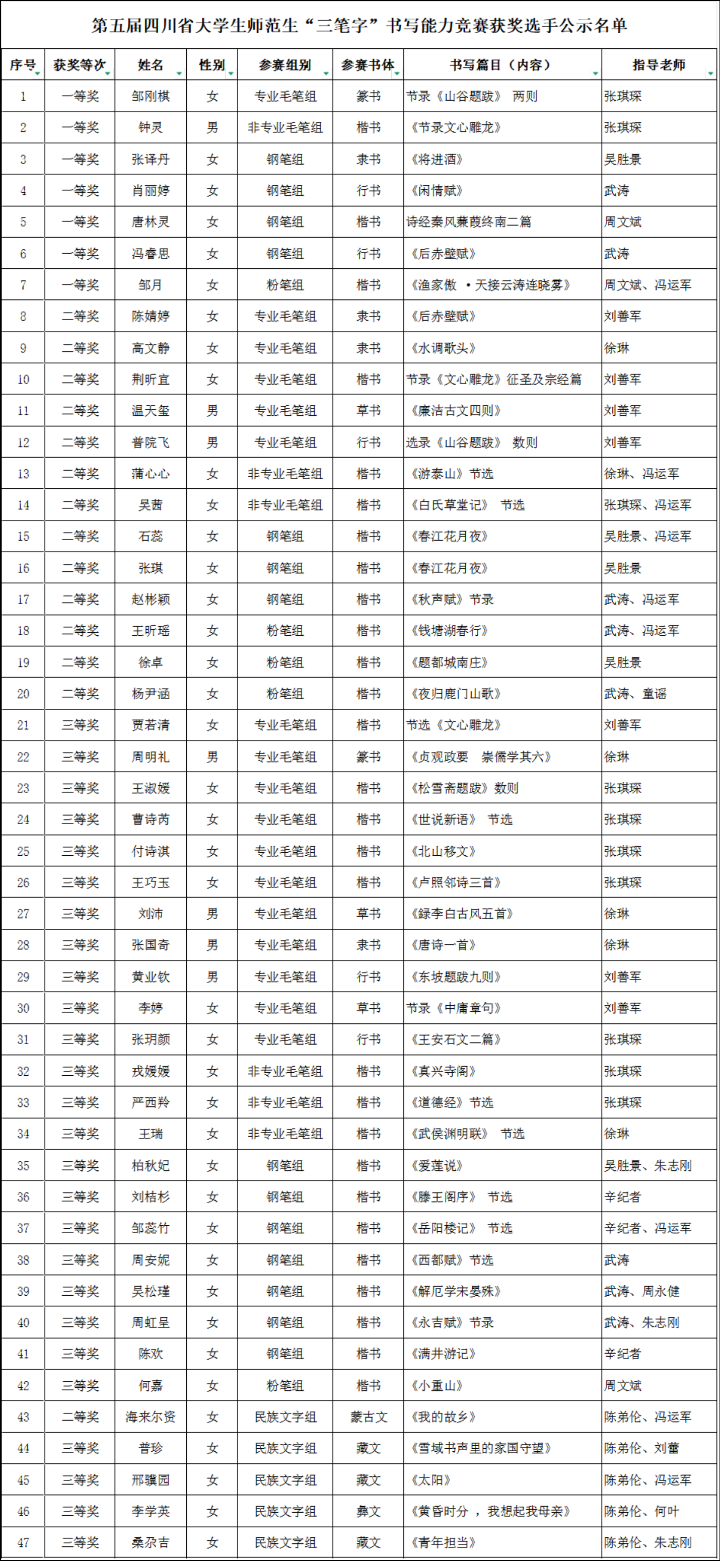 本网讯(文、图/胡涛、杨婉馨、柴婷)9月29日,2025年(第五届)四川省大学生师范生“三笔字”书写能力竞赛获奖名单公示。我校学生在毛笔、硬笔、粉笔、民族文字等组别共获奖47项,获奖总数位居全省第四,其中,一等奖7项,二等奖14项、三等奖26项,4名指导老师获评“优秀指导老师”。